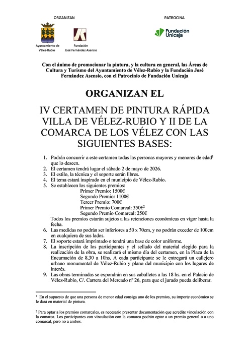 Se celebrará celebrar el próximo día 2 de mayo. Para mayor información consultar la bases del certamen a través del Facebook e Instagram, José F. Asensio y fundacionjosefernandezasensio. en la web del ayuntamiento velezrubio.es y para cualquier duda e través del WhatsApp 662346235.